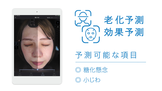 現在の肌状況と、将来のお肌が糖化・シミといった老化が起きた状態の比較が出来ます。
